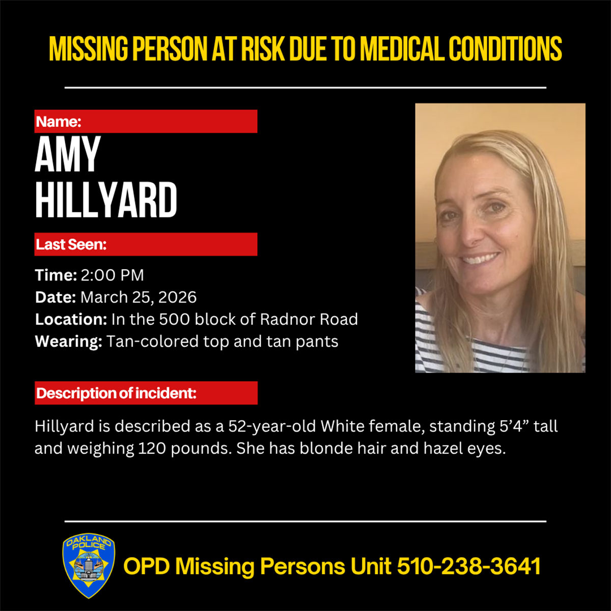 monica_b1998English · 21 days agoMissing Person Amy Hillyardplus-squarewww.oaklandca.govexternal-linkmessage-square0linkfedilinkarrow-up18arrow-down10