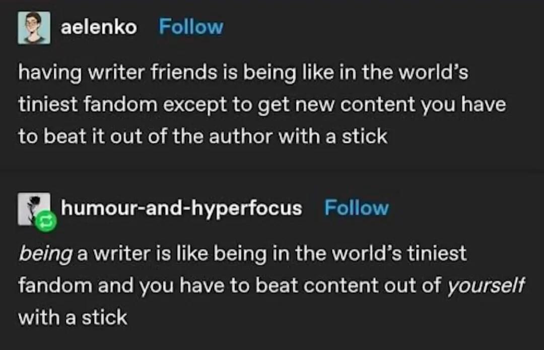 arrow-up112arrow-down1imageIf I'm understanding this correctly, beating someone with a stick is essential to the writing process 🤔😂plus-squarecdn.masto.hostNick East (Indie Writer)@mastodon.art · 25 days agomessage-square1linkfedilink