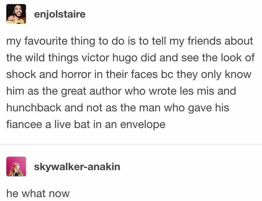 Nick East (Indie Writer)@mastodon.art · 2 hours agoOkay, I've read Les Miserables so I feel that I'm now entiteled to know what else Victor Hugo got up to 😁plus-squarecdn.masto.hostimagemessage-square0linkfedilinkarrow-up114arrow-down10
