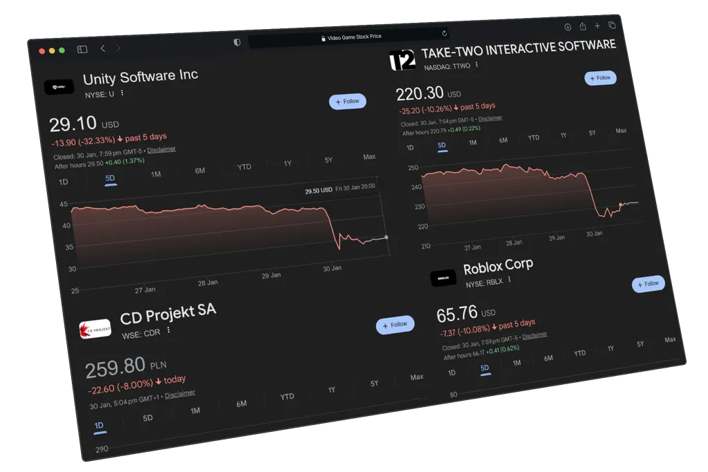 Unity’s share price fell the most at 20%, since it’s a popular game engine. Generally speaking, that’s how most games operate: they use a software framework, such as Unity or Unreal Engine, which provides basic functionality like physics, rendering, input, and sound. Studios then build their vision on top of these, and some developers even have their own custom in-house solutions, such as Rockstar’s RAGE or Guerrilla’s Decima.