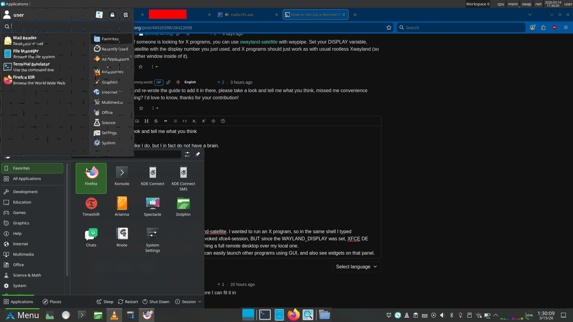 vncserverto, well, launch a VNC server. That invoked xfce4-session, BUT since the WAYLAND_DISPLAY was set, XFCE DE attached to waypipe rather than XTigerVNC, launching a full remote desktop over my local one.And out of that, xfce4-panel proves pretty useful. I can easily launch other programs using GUI, and also see widgets on that panel.