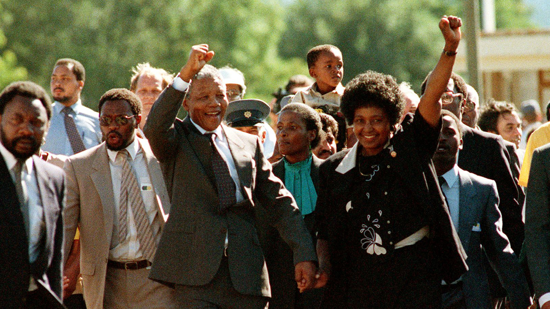 Image: Nelson Mandela, with his wife, Winnie, walks to freedom after 27 years in prison on Feb. 11th, 1990, in Cape Town. [AP via NPR]