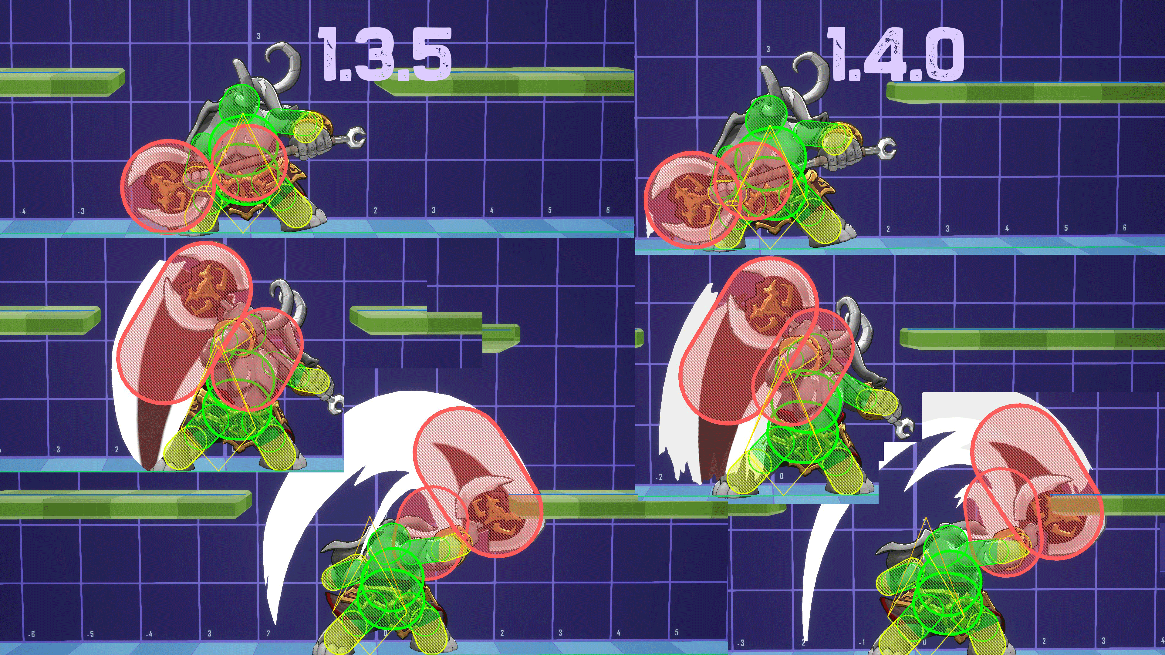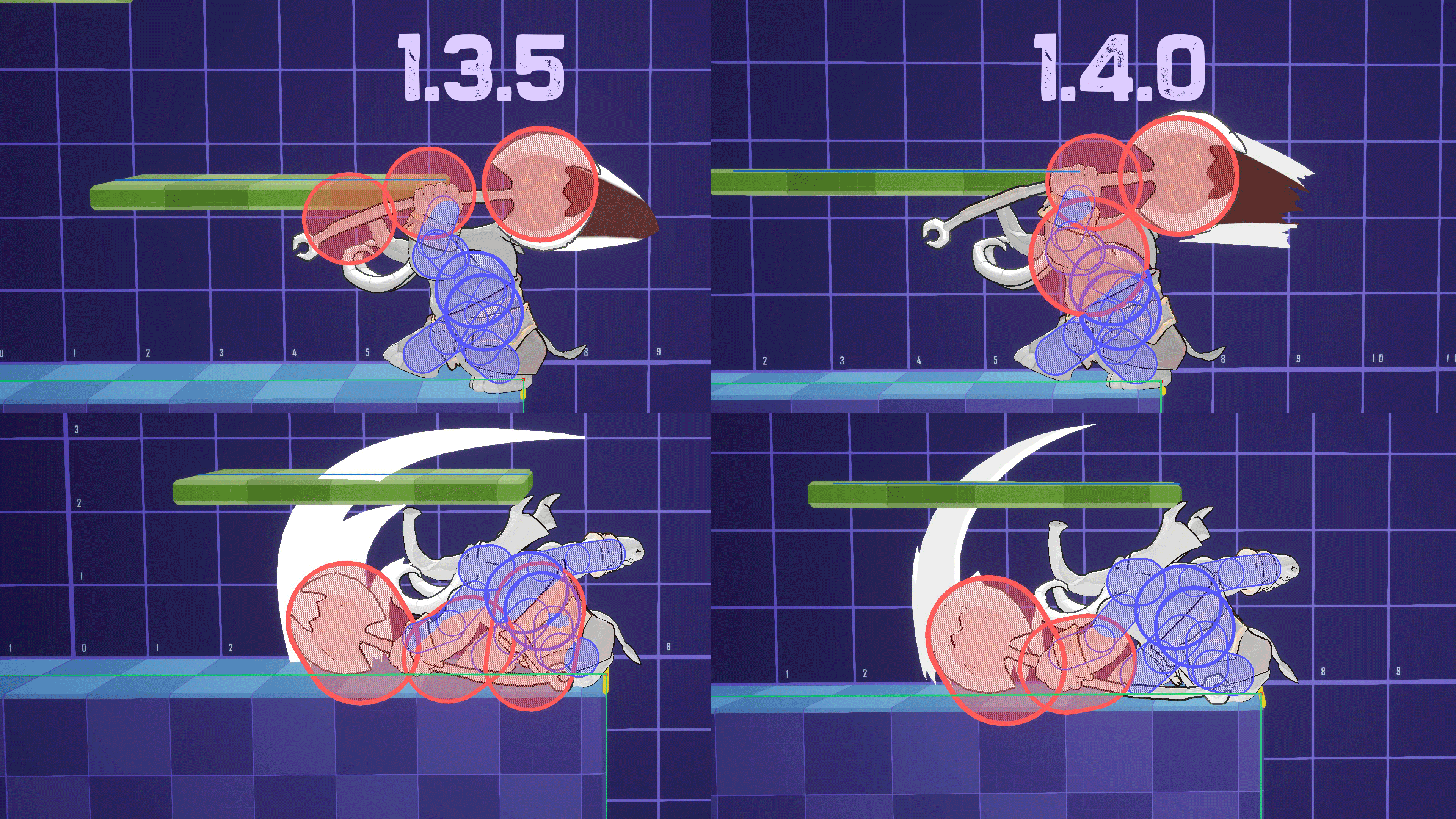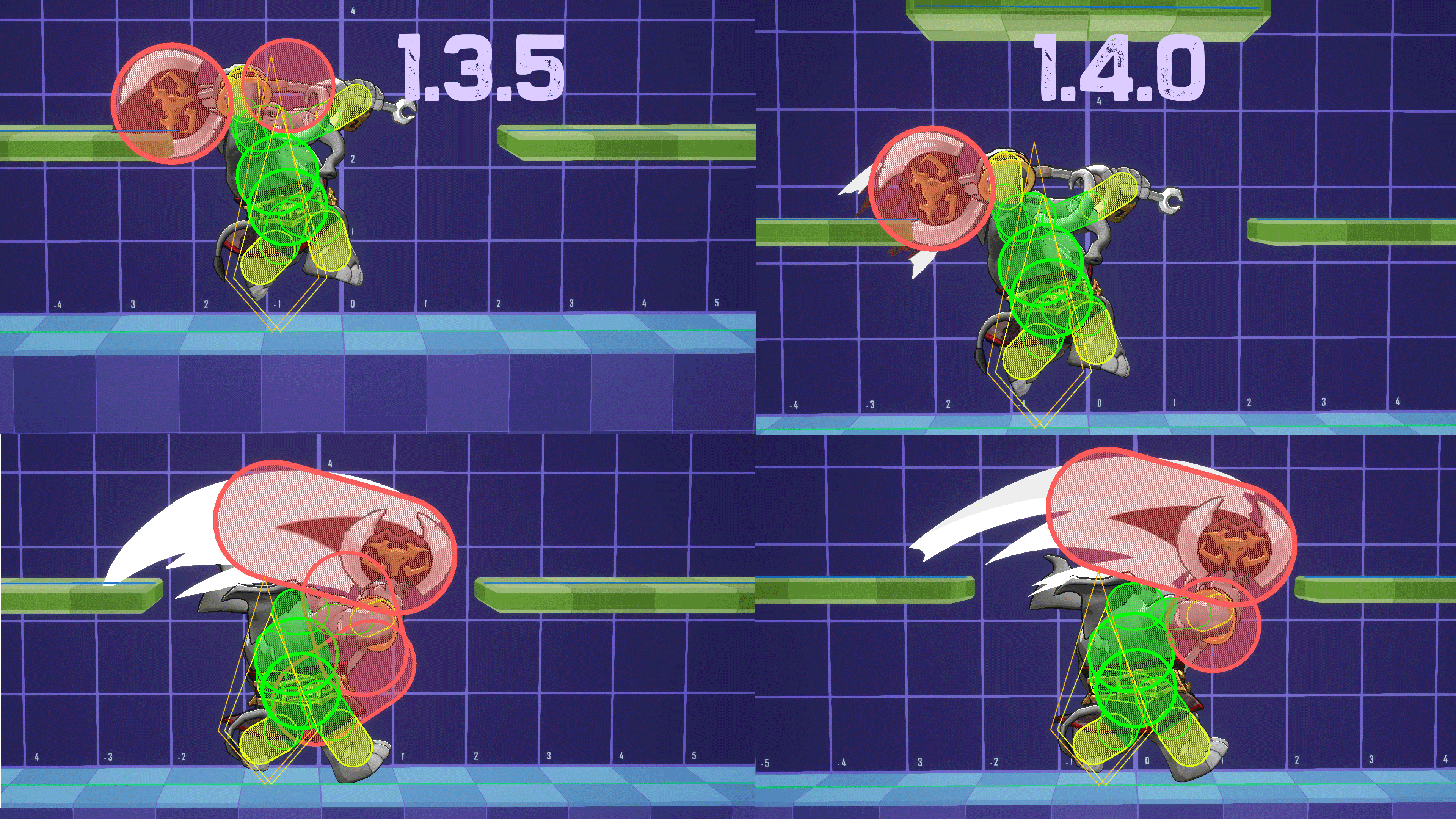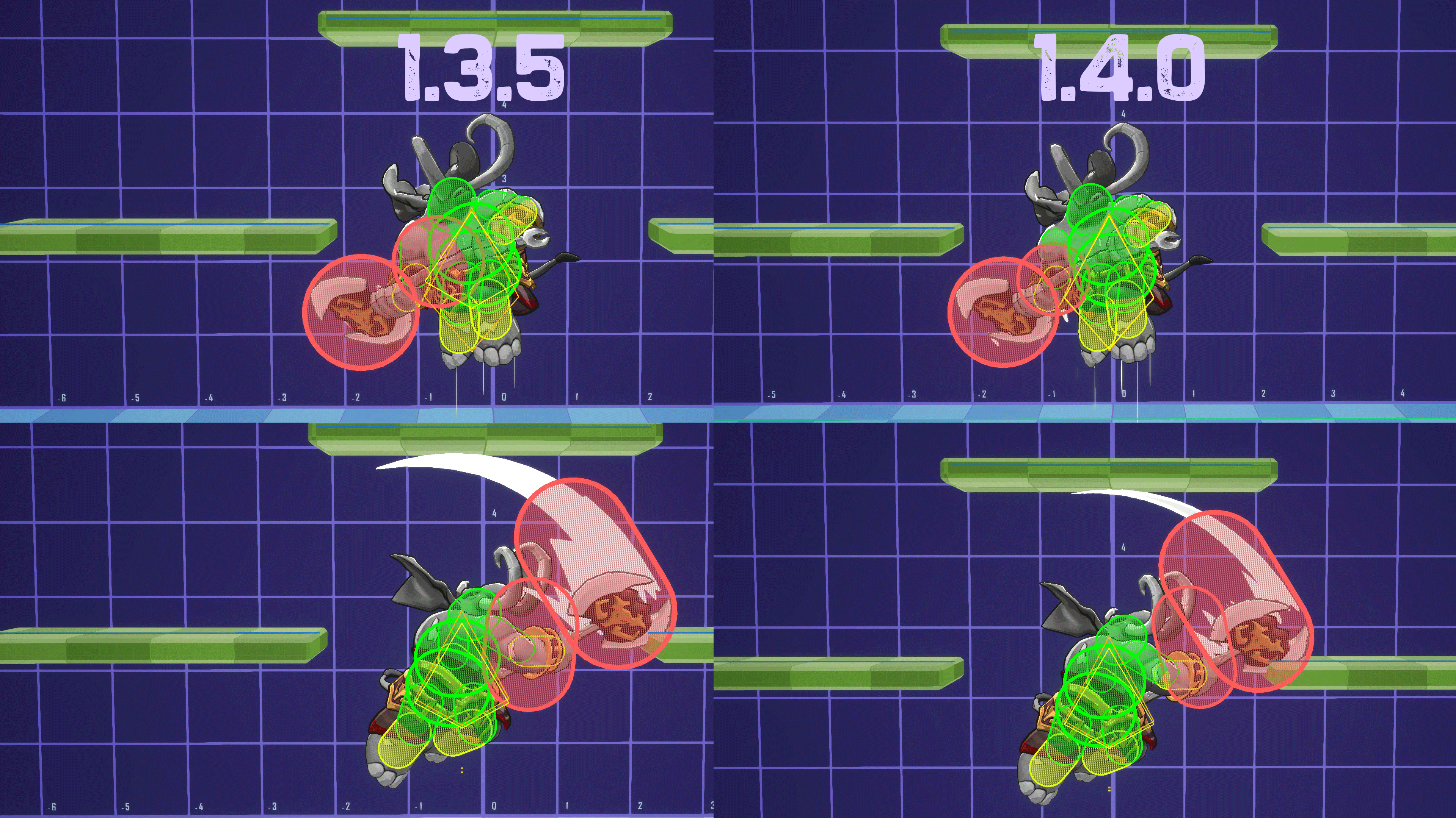 - The hitboxes on this move were a bit too large for our liking, making it cover a bit more space for a longer duration than we felt it should. These changes also reduce the inward range of each swing slightly.