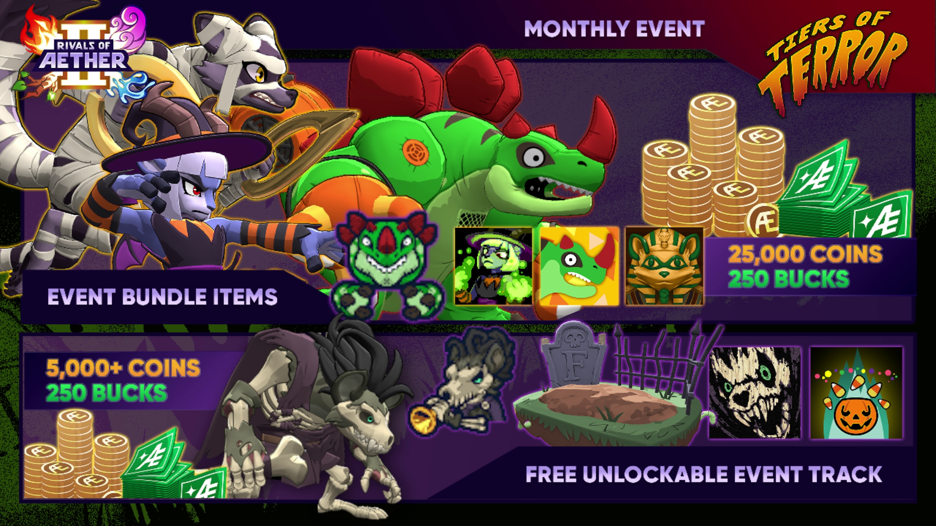Our free event track for October contains the Skeleton Forsburn Emote, the Treatsplosion death effect, Grave Plot platform, and the Skeleton Forsburn skin and icon. Players equipping any event skins above, or the Slasher Clairen, Black Widow Ranno, or Vampire Zetterburn skin will receive 20% Bonus XP on the event track. There’s also a brand new Purple Slasher Clairen palette in the in-game shop!