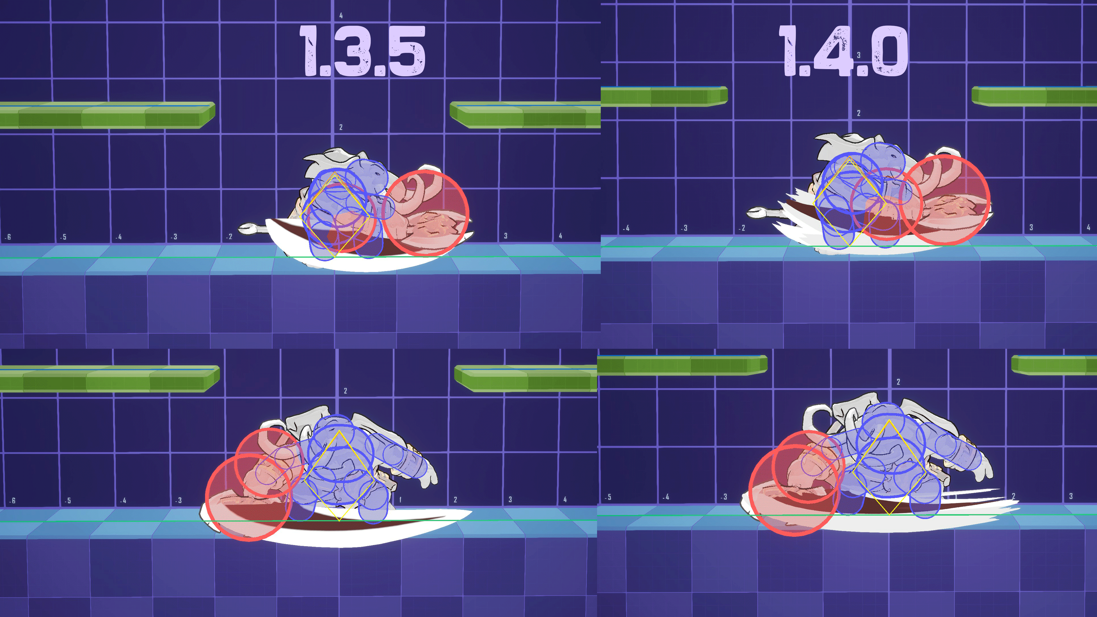 - These changes clean up the hitbox arc a bit, since it was a bit erratic previously. The shoulder hitbox was added to make sure it doesn’t whiff against opponents right on top of the ledge.